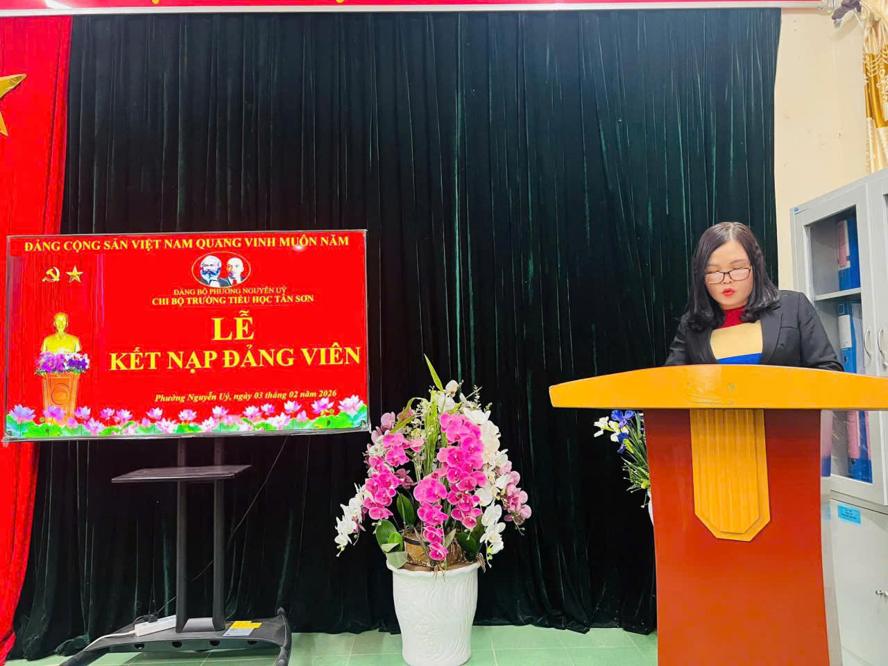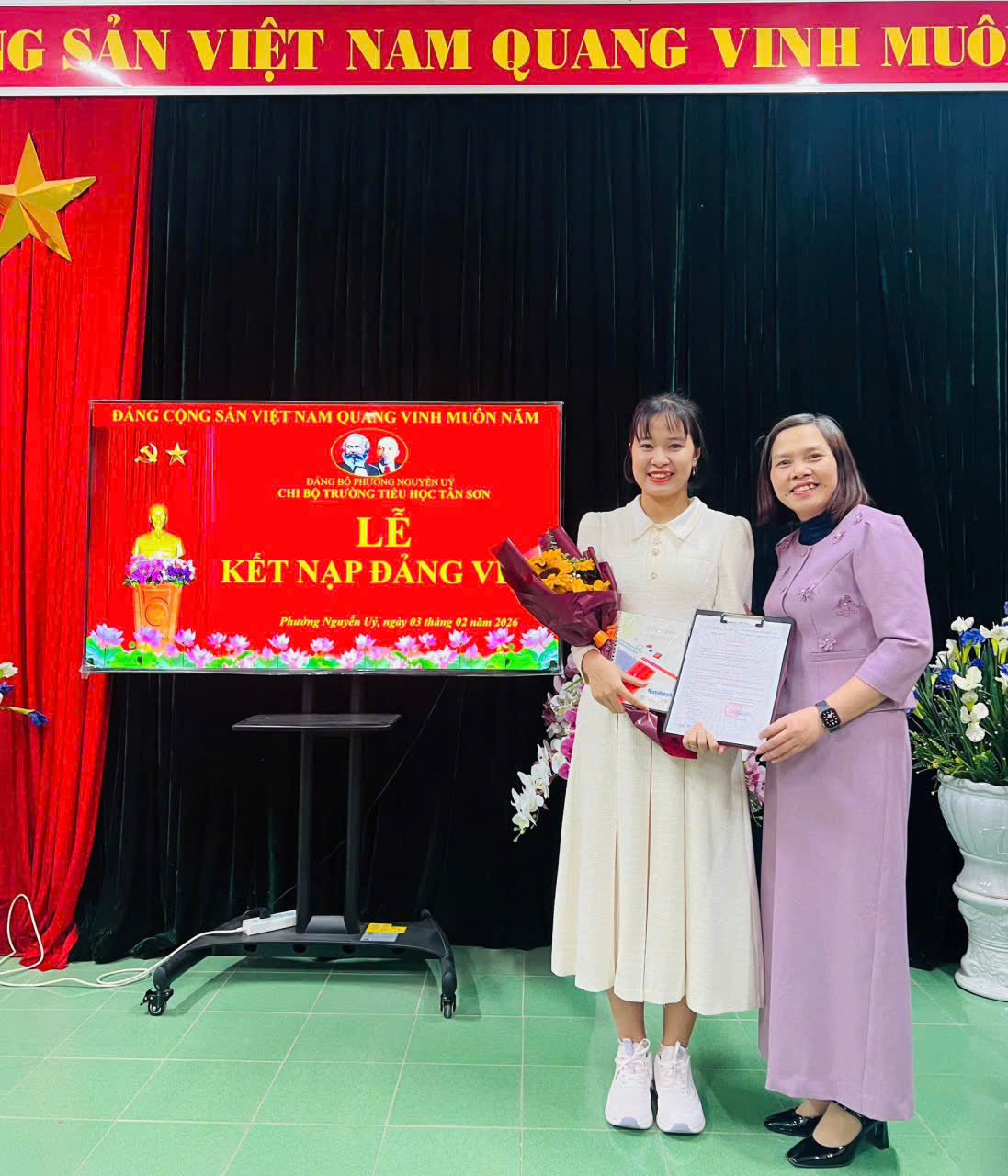 Chiều cùng ngày, Chi bộ trường Tiểu học Tân Sơn đã tổ chức Lễ kết nạp đảng viên mới cho quần chúng ưu tú Nguyễn Hải Vân. Sau khi đồng chí Bí thư Chi bộ công bố và trao Quyết định kết nạp, đảng viên mới đã tuyên thệ trước Đảng kỳ, thể hiện quyết tâm tiếp tục rèn luyện, tu dưỡng phẩm chất đạo đức, nâng cao năng lực chuyên môn, hoàn thành tốt nhiệm vụ được giao.