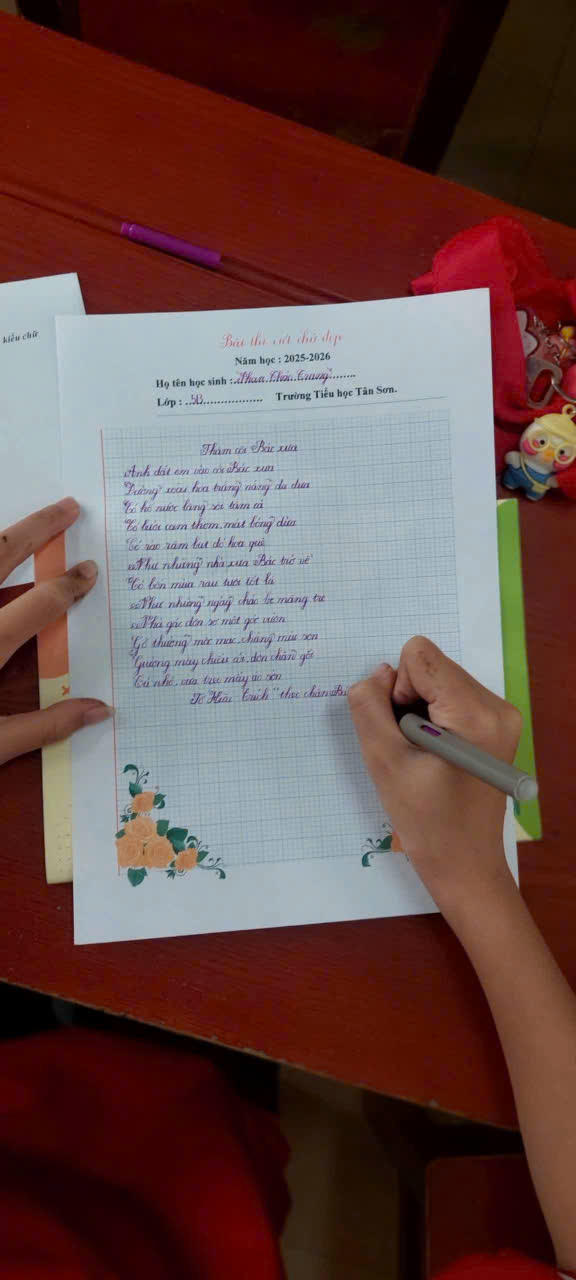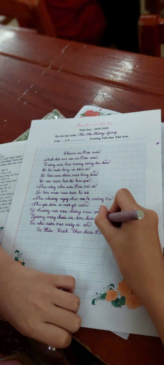 Thực hiện nhiệm vụ năm học 2025-2026, chiều 25/3/2026 trường Tiểu học Tân Sơn phường Nguyễn Uý, tỉnh Ninh Bình tổ chức Hội thi Viết chữ đẹp cho Giáo viên và Học sinh. Hội thi có 33 GV và 161 học sinh tham gia, góp phần thúc đẩy phong trào giữ vở sạch – viết chữ đẹp của học sinh; tạo điều kiện cho giáo viên, học sinh trau dồi kĩ năng viết chữ và trình bày vở sạch đẹp; góp phần nâng cao chất lượng dạy viết chữ của giáo viên. Trên cơ sở đó hình thành và phát triển đức tính tốt như: Cẩn thận, thẩm mĩ, kiên trì, sáng tạo và biết giữ gìn tiếng nói, chữ viết của dân tộc.